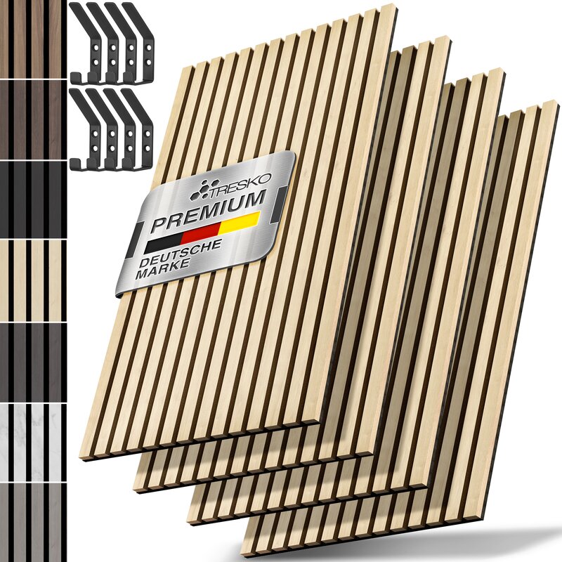 TRESKO® Akustikpaneele Holz 120×60 cm inkl. Kleiderhaken | Wandverkleidung Eiche Natur als 3D Lamellenwand | Holzpaneele Paneele für Schallschutz | Akustik Wandpaneele mit Montageset