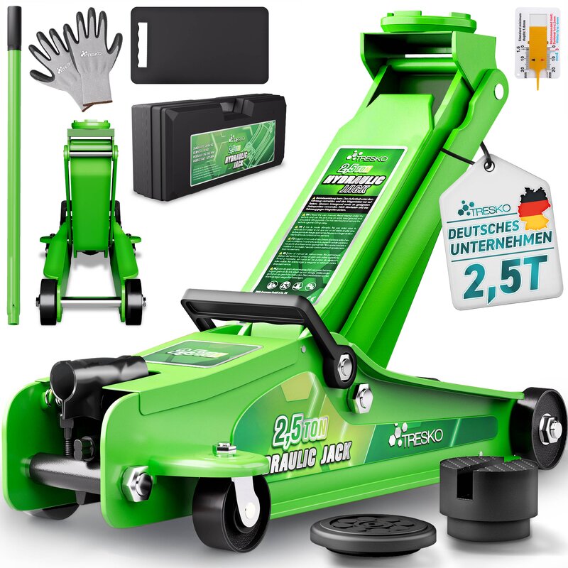 TRESKO® Wagenheber hydraulisch 2,5 - 3T Hubhöhe | Hydraulik KFZ Rangierwagenheber flach Doppelkolben & 360° Rollen inkl. 2X Gummiauflage, Schutzmatte, Handschuhe